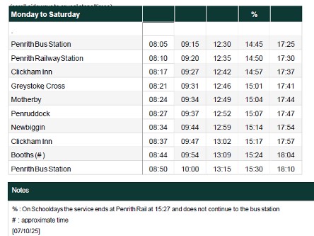 • The variations in the afternoon timetable with certain journeys only running on Saturdays and on School Holidays have been eliminated. The only variation will be the 14.45 journey on the return to Penrith will end at the Rail Station, rather than the bus station on schooldays.